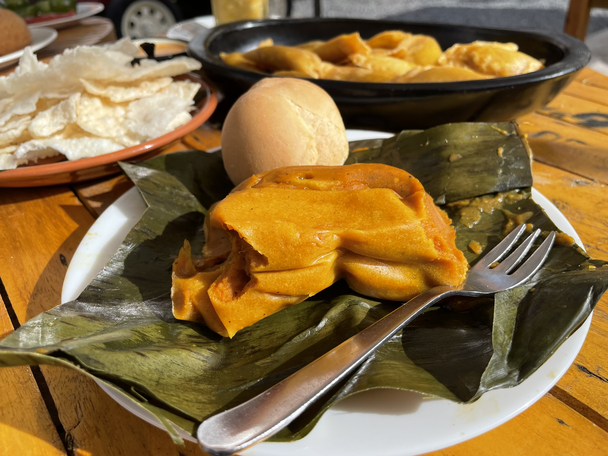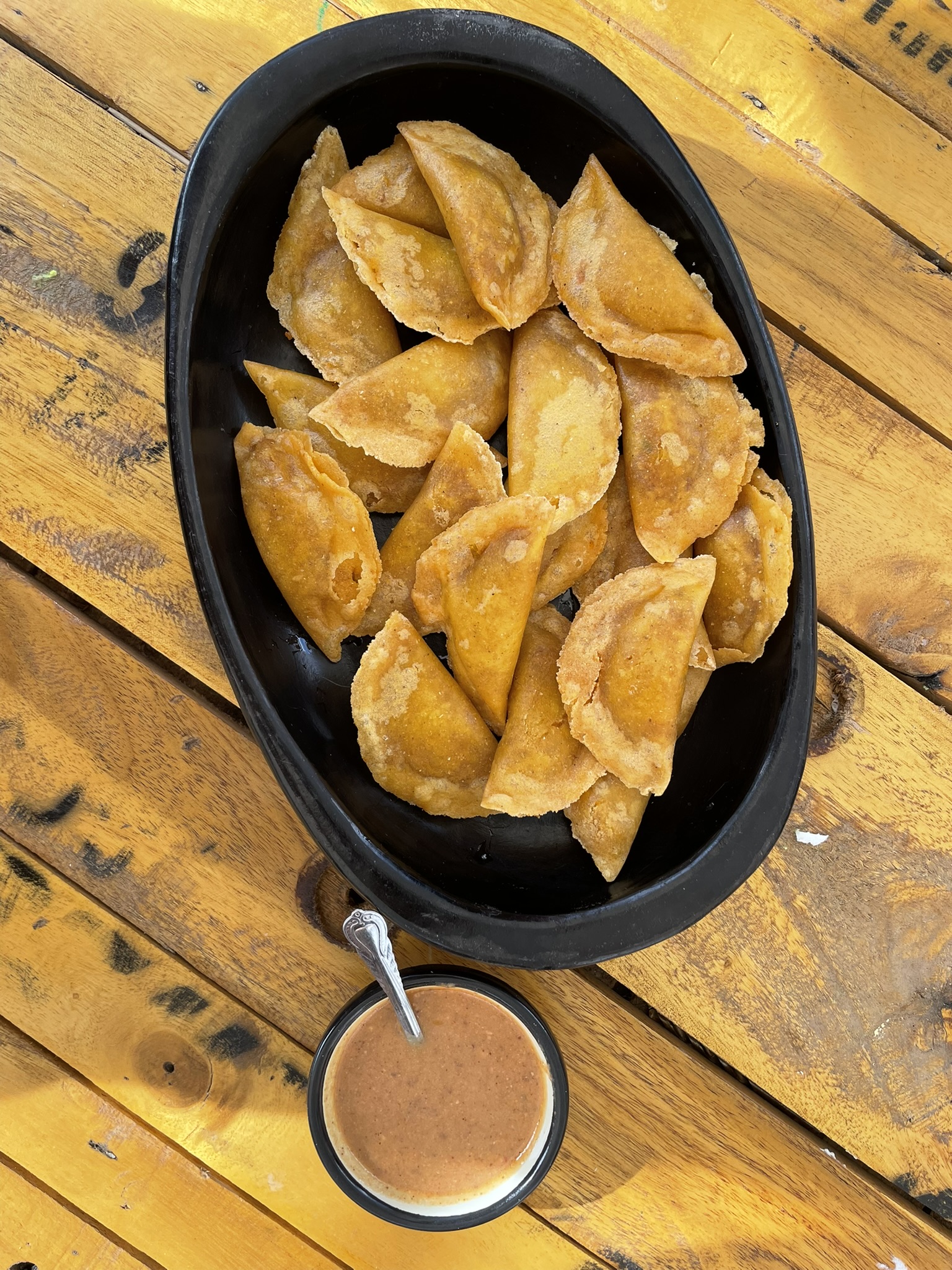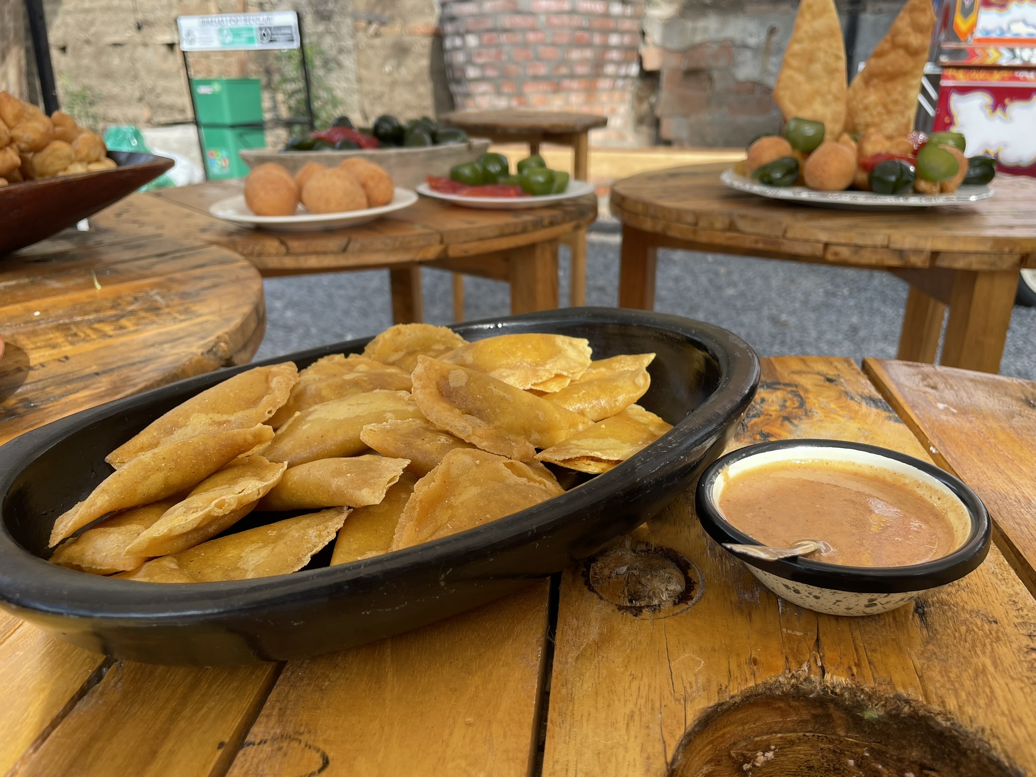 Deliciosas empanadas y tamales rellenos de un guiso de papa criolla y maní tostado, servidos con ají de maní.