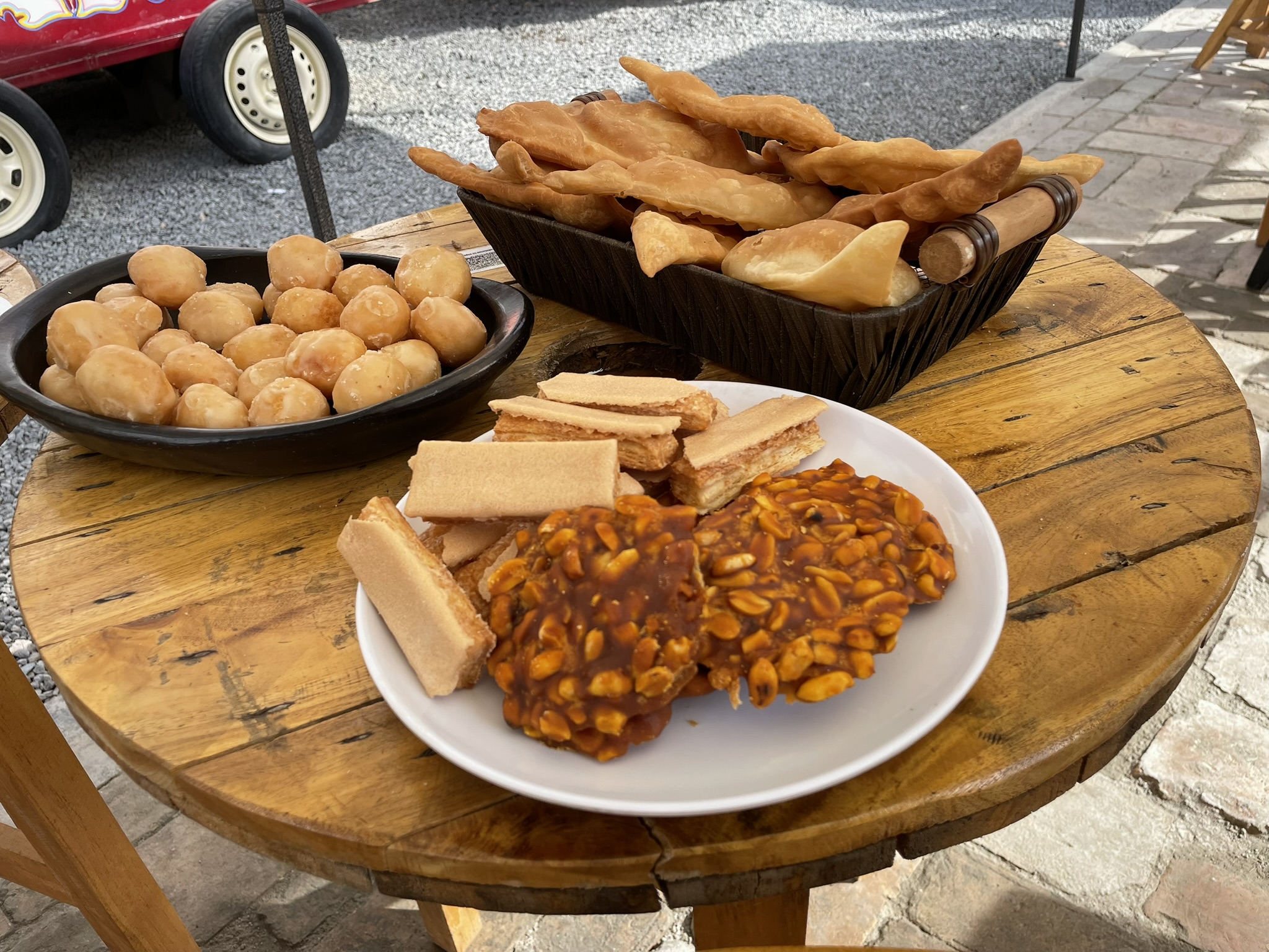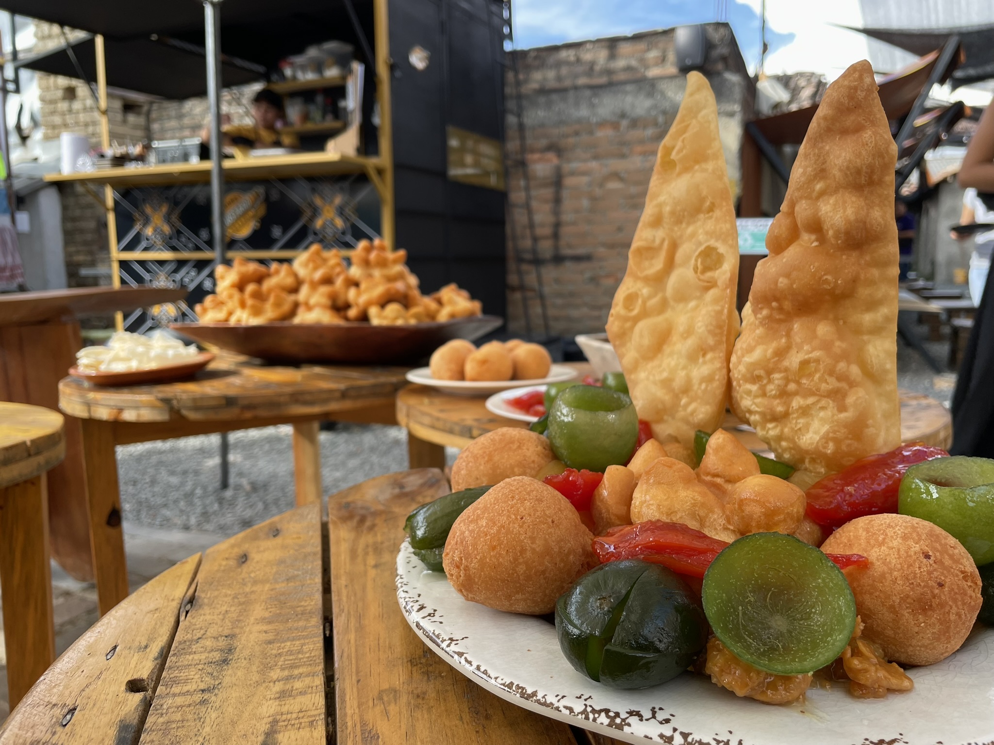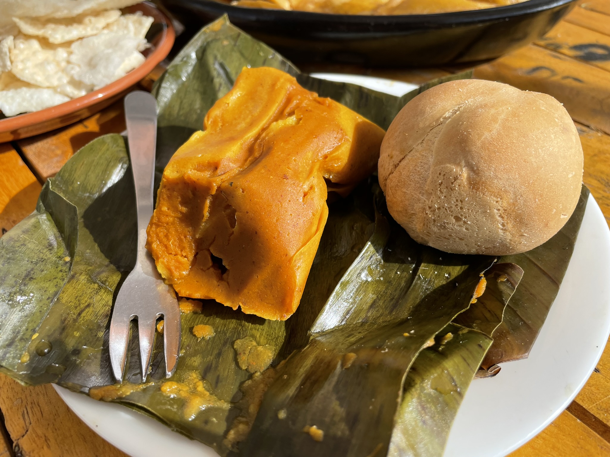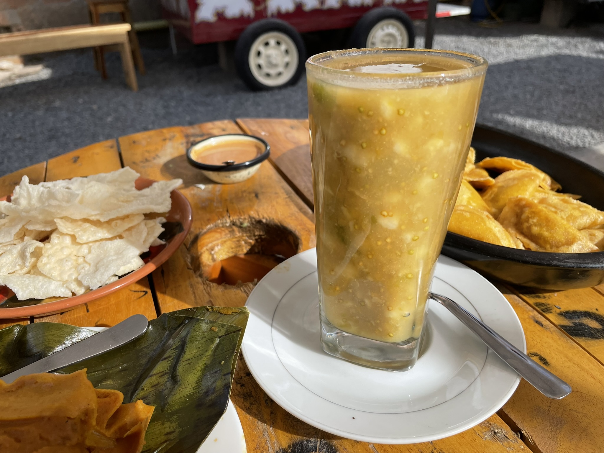 Deliciosas empanadas y tamales rellenos de un guiso de papa criolla y maní tostado, servidos con ají de maní.